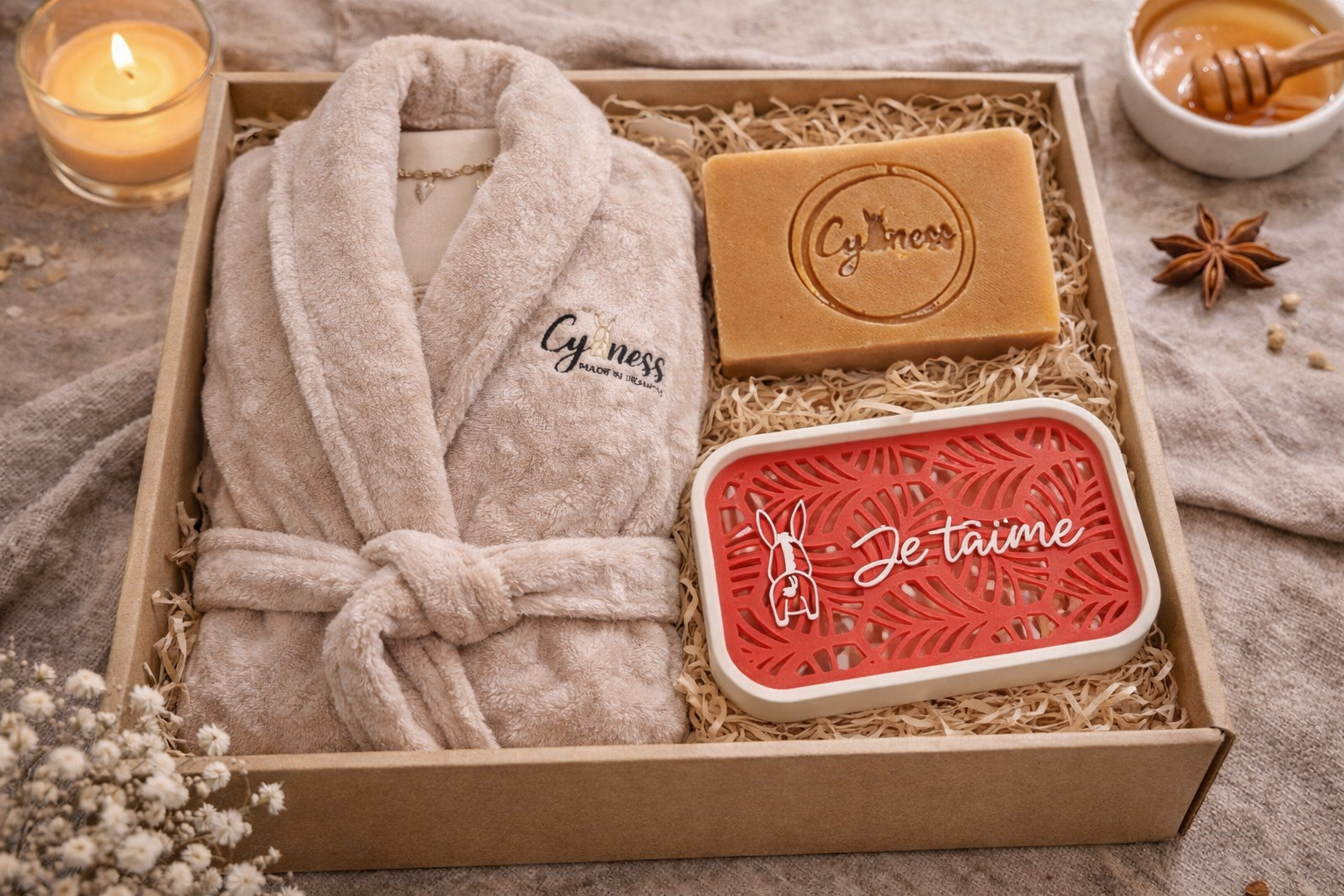 Nos produits sont artisanaux et respectueux de la peau, combinant qualité premium et plaisir sensoriel. Le peignoir multi-couleurs permet un choix personnalisé selon les goûts, et le porte-savon écologique complète l’ensemble pour une touche de luxe responsable.