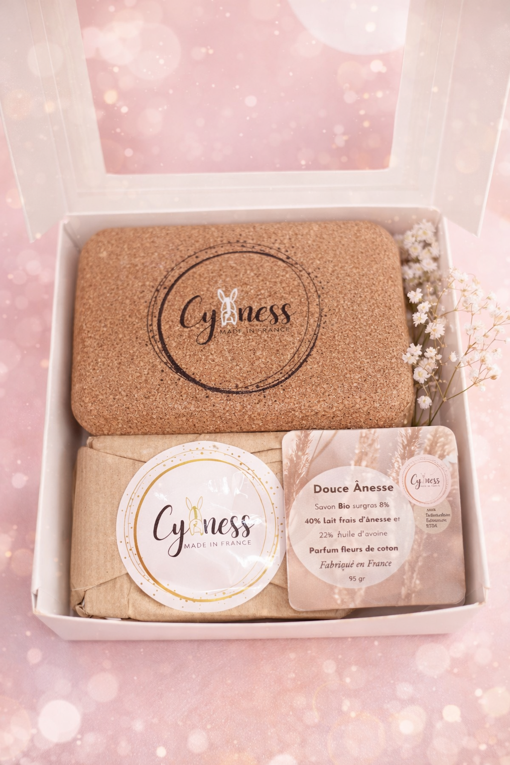 Découvrez le coffret Cyaness Porte-savon en liège & Savon Douce Ânesse 40 % lait d’ânesse, un duo naturel, écologique et raffiné, parfait pour offrir ou se faire plaisir.